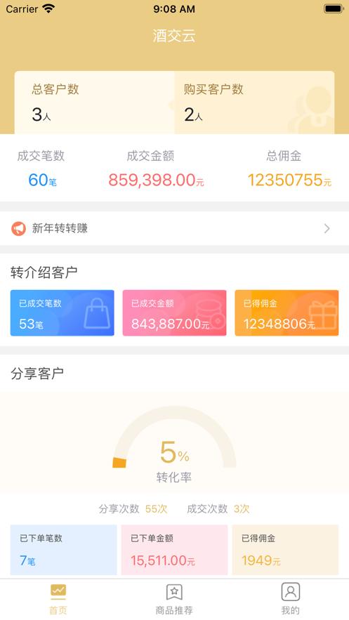 1、使用酒交云客户端可实现以下功能:客户经纪推荐、业绩统计、营销管理;