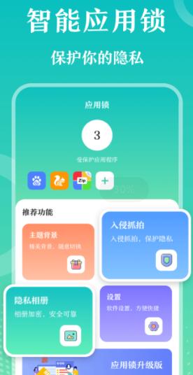 应用锁是一款专注于保护用户隐私的应用,可以加密你手机上的任何软件,属于你的私人信息保险柜,一键锁屏,安全贴心,是专业可靠的智能安全私密应用隐藏APP锁,隐私保护神器,是值得你信赖的隐私管家,是你的手机安全卫士!你再也不用担心别人使用你的手机时会泄露你的私人信息,你值得拥有!