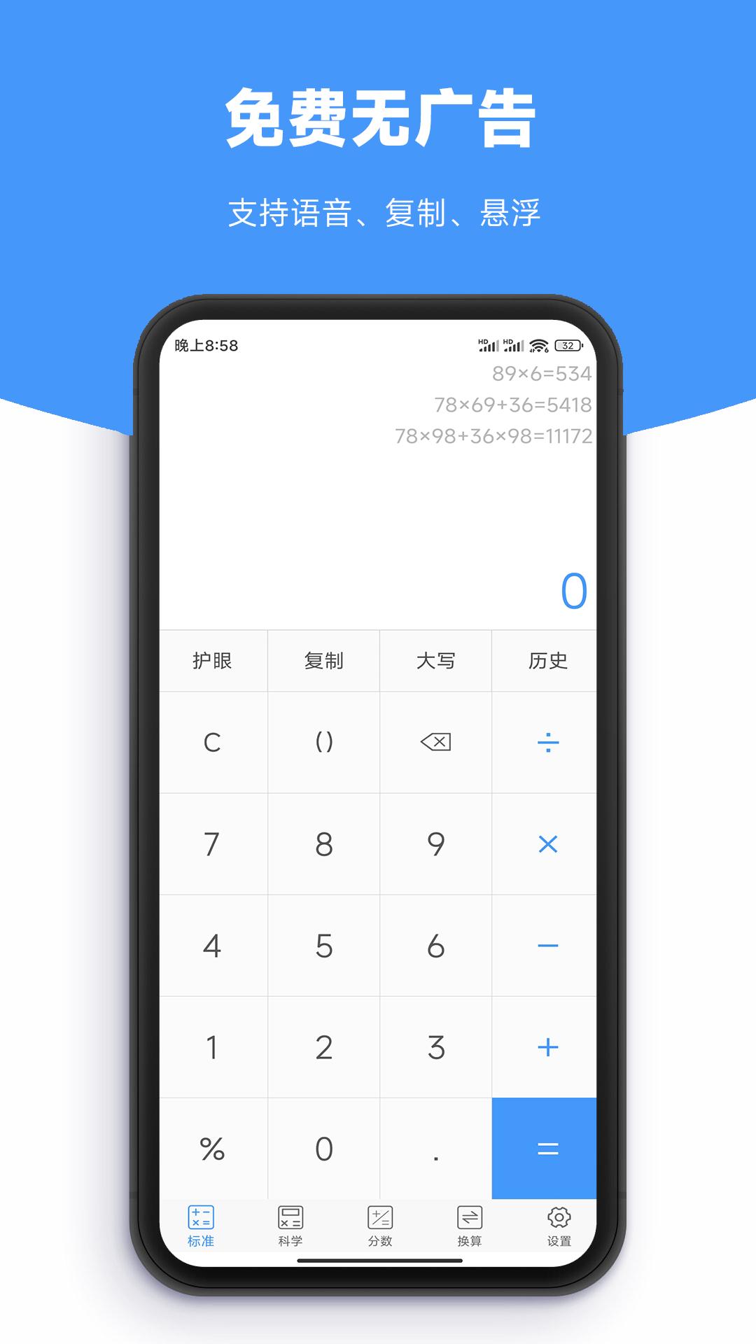 1 基础计算器、科学计算器、分数计算器,支持语音功能,按键震动