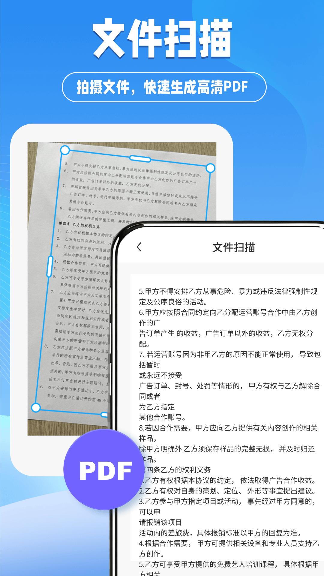 * 支持高清扫描单张文件、多张文件或书籍,快速生成PDF扫描件,扫描件可调整色彩、亮度等