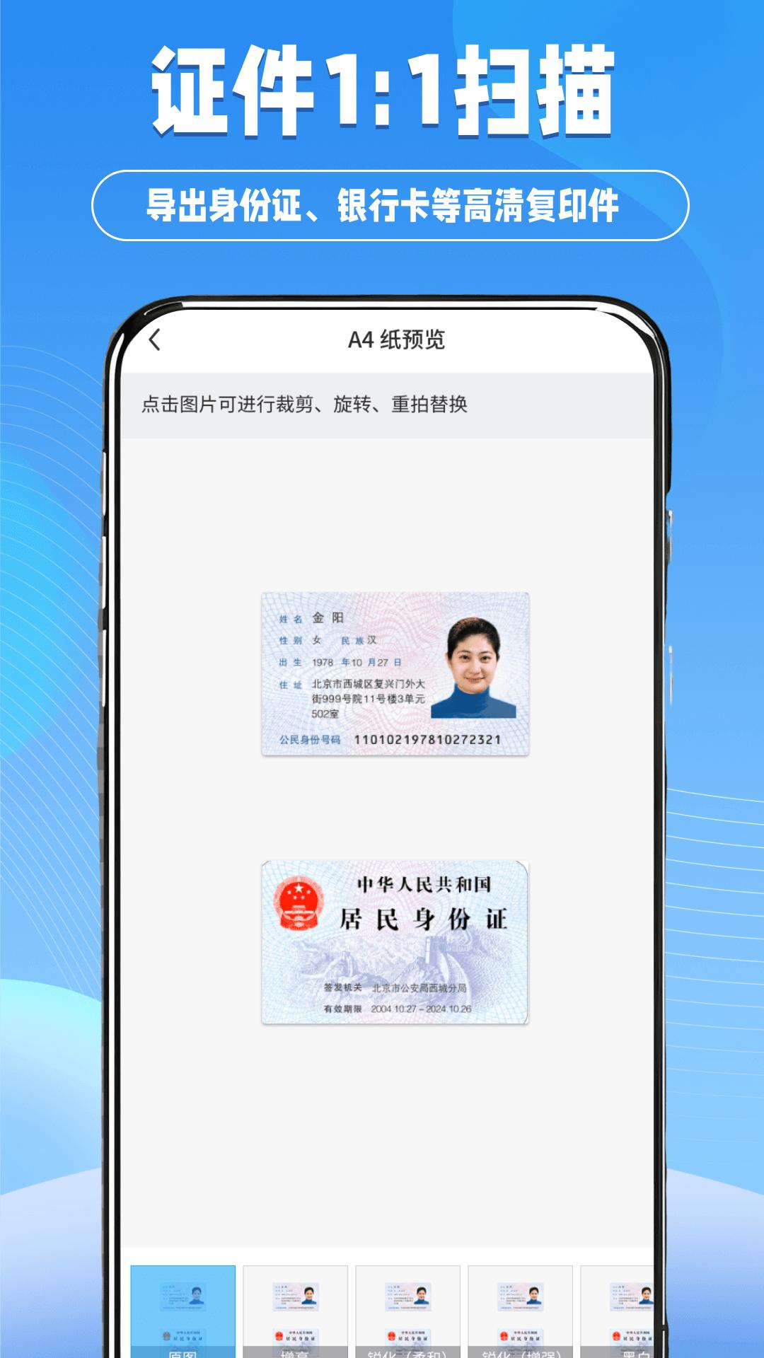 * 支持身份证、银行卡、护照等各种证件识别扫描,1:1生成电子复印件