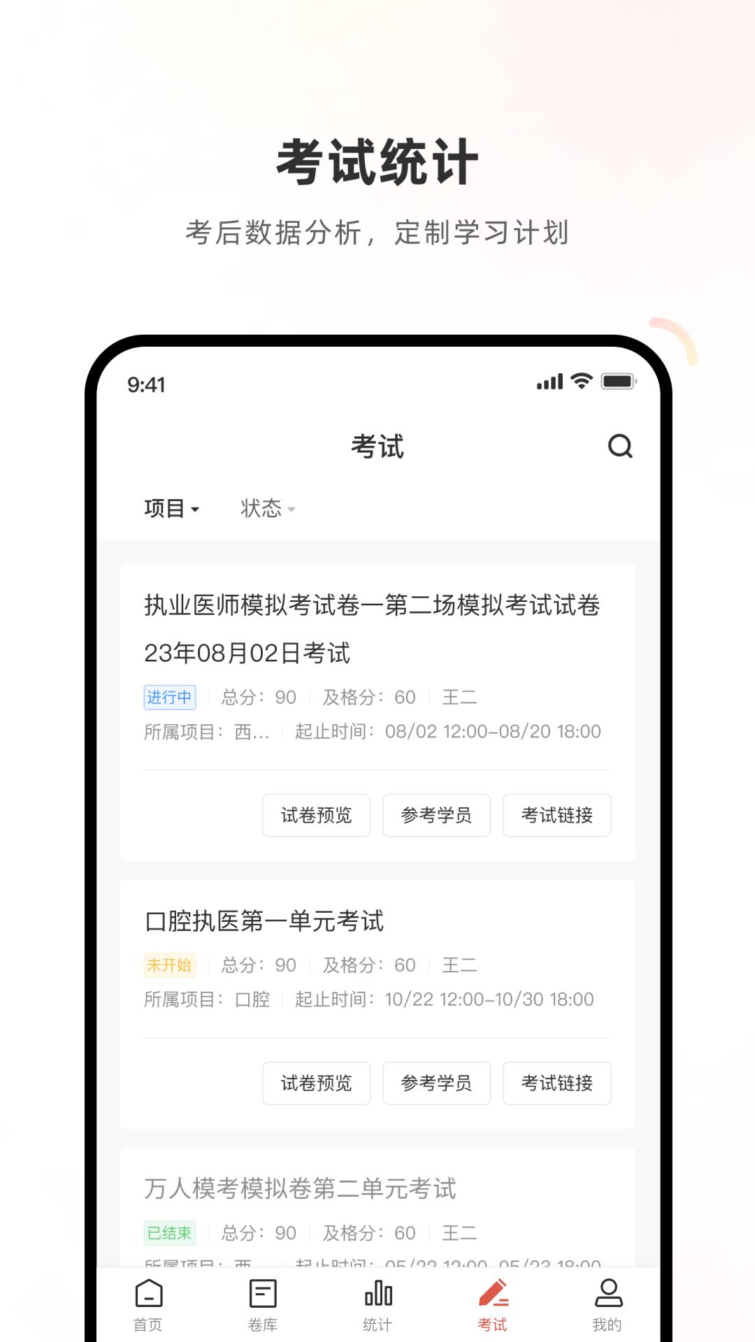 对试卷进行存档和统计分析的工作,帮助用户更好的组织考试,自定义导入试卷