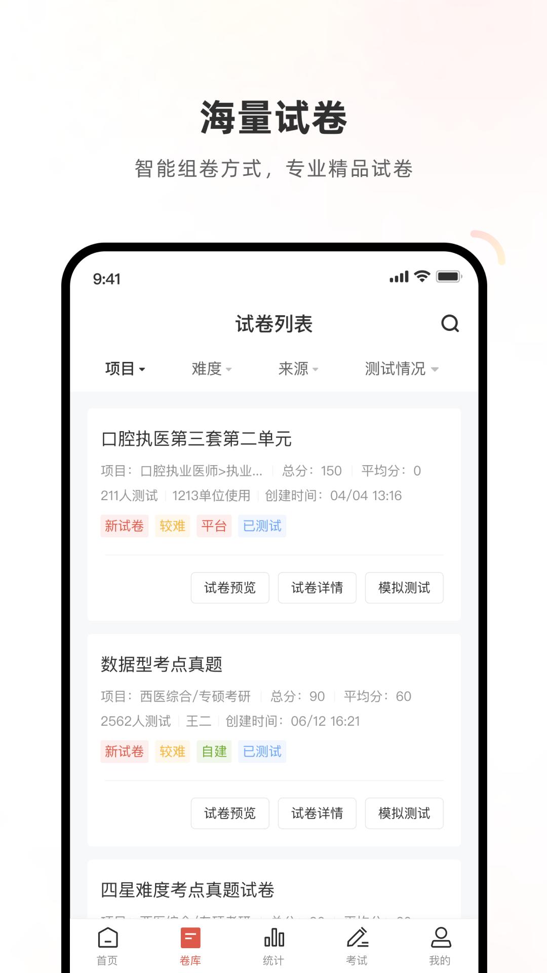 医学考试系统企业版手机端app是医生以及医学生参加培训和考试的好帮手,题库和试卷超丰富,能够进行阶段性的测试,可以根据试卷的难度来源项目以及测试的情况来筛选自由组卷,精准训练和测试。