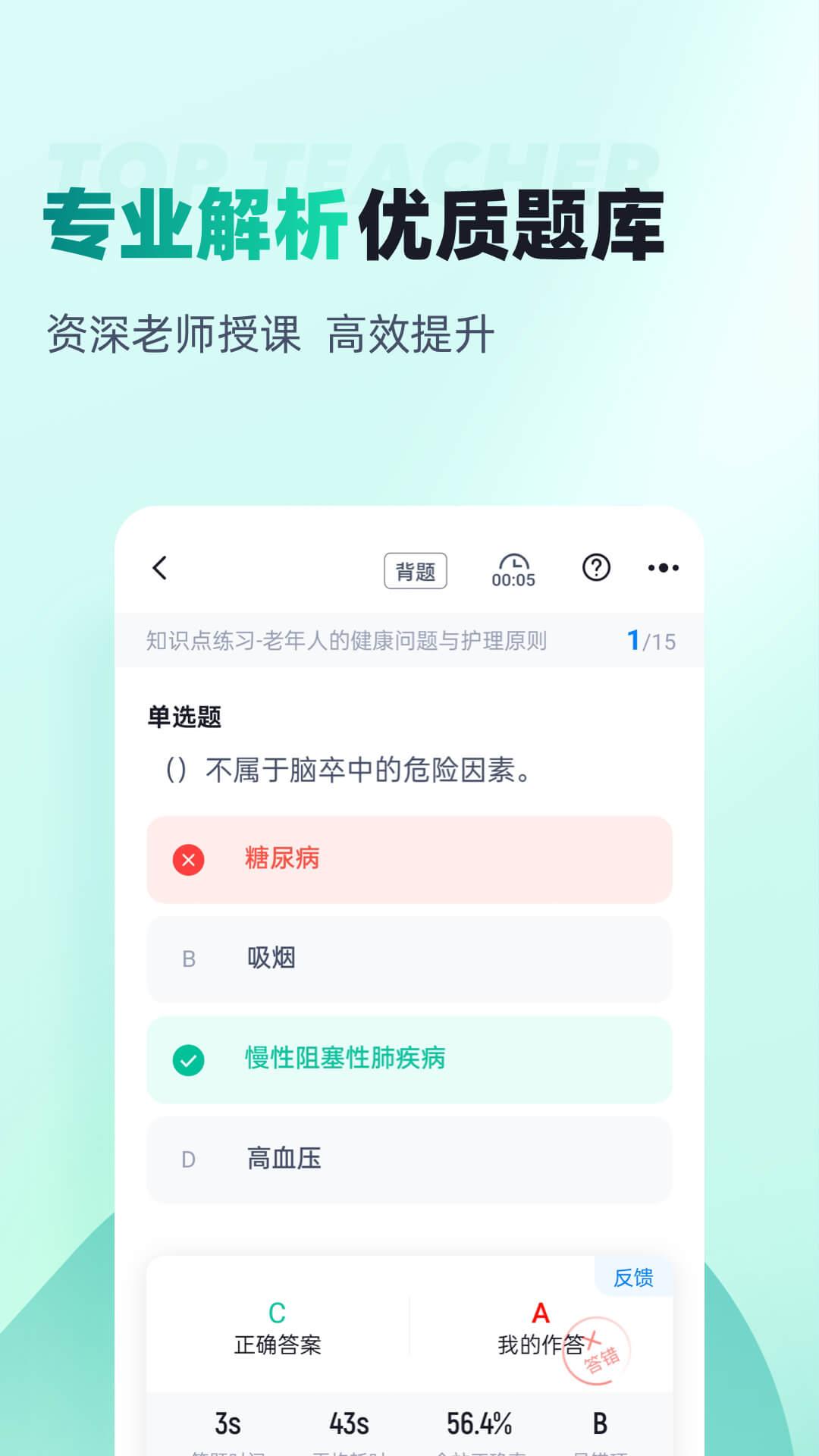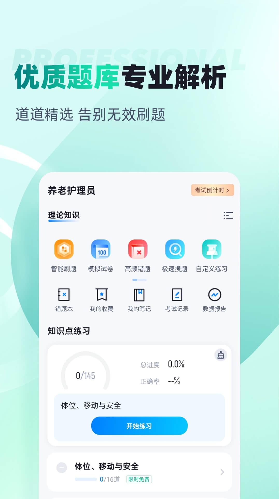 养老护理员考试聚题库,是一款专注养老护理员考试的刷题应用,全力辅助考生备考。 题库收纳历年真题,全面覆盖老年生理心理、生活照料、疾病护理、安全急救等考点,助考生把握考试重点。它支持顺序、随机、模拟考场等多样刷题模式,全国与地区卷练习皆有,还能全真模拟考试氛围。新增语音、拍照搜题功能,快速答疑解惑。不仅如此,它还为考核者提供智能组卷,随机、选题、抽题组卷任你选,能自由设置各类组卷策略。更有贴心的错题巩固、笔记记录、学习进度跟踪功能,方便考生强化薄弱点,了解学习状态,调整计划。
