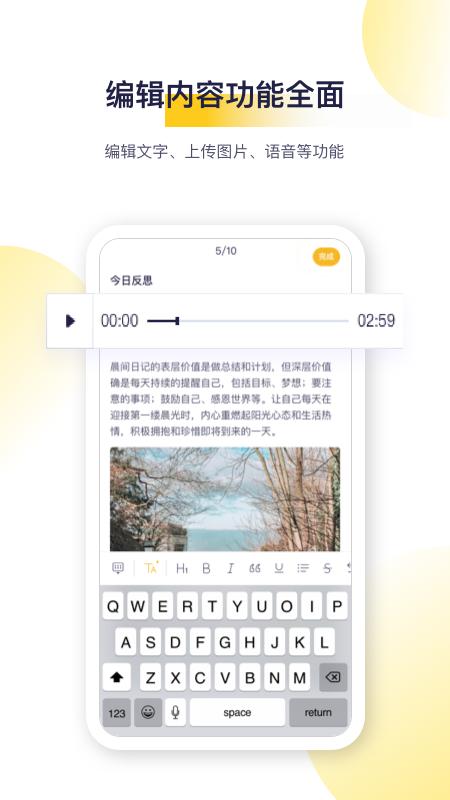 2、专业的日记模板:内置喜马拉雅时间管理类课程著名讲师提供的专业日记模板,让写日记记录更有针对性和建设性。同时您也可以自定义专属模板,不必每天重设问题,让记日记变得更有效率和方向。