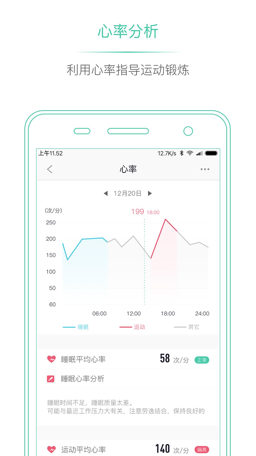 【健康数据展示与分析】通过手环采集步数、运动锻炼、睡眠、动态心率数据,同步到埃微助手,埃微助手对数据进行分析处理,并给出评价与改进建议;