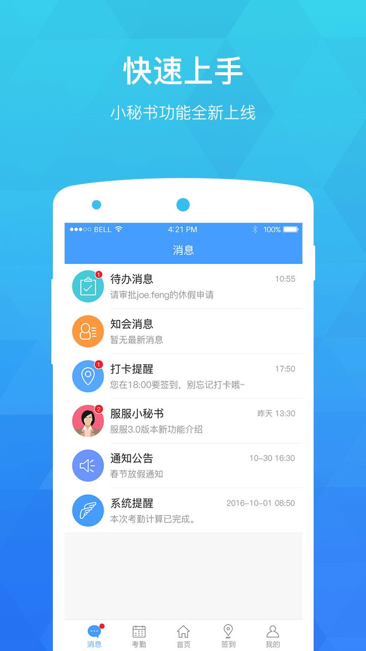 服服app下载是一款企业服务平台,平台拥有考勤签到,薪资,互动社交,移动办公等等丰富功能,可以更好的服务企业,需要的朋友欢迎前来下载使用。