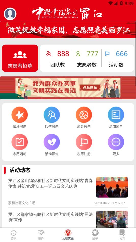 幸福罗江app是专为罗江人制作的融媒体移动平台,平台拥有新闻,服务,文明实践,圈子,报料等功能板块,可以帮助更好的引导及服务罗江。