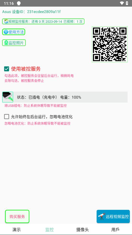 本机做被控,在第2台手机上安装本App,使用主控,扫一扫本机的二维码,即可看本机视频监控(要勾选使用被控服务)、智能监控抓拍照片。