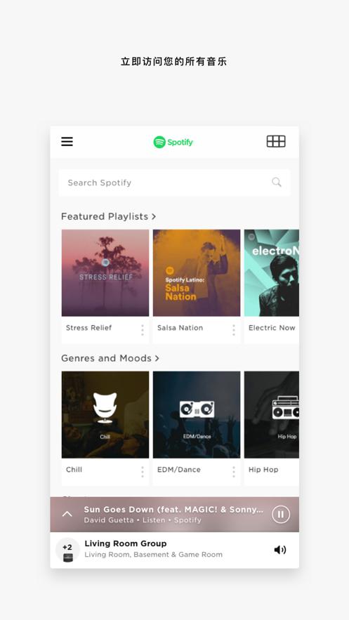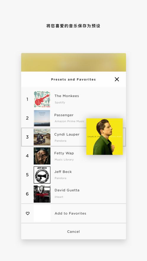 利用 Spotify 的“每周发现”或 Pandora 的“指纹电台”等“现成的”预设个性化设置您家中的所有房间。一键总是可以访问全新的喜爱音乐列表,无需查找您的手机。