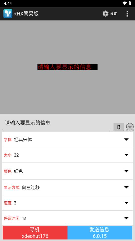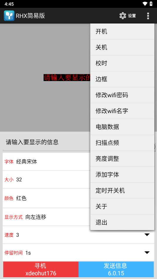 2、发送:在手机通过WiFi与控制卡连接之后,可通过发送信息按钮把节目信息发送给控制卡,设置信息也需在连接之后发送。
