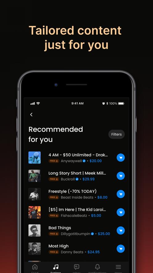 提供个性化和推荐:聆听精选的播放列表,例如 Drake、Lil Baby 和 Juice WRLD Type Beats(以及更多)。您传播自己喜欢的节拍越多,我们就越能了解您作为创作者的情况。我们的使命是为您提供适合您口味的新鲜内容。