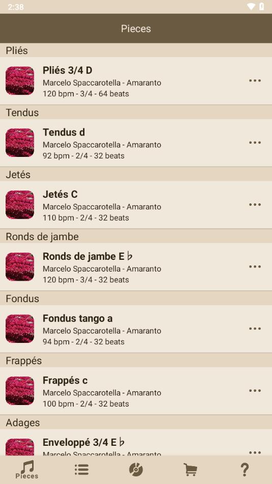 在Ballet Class中,您可以从钢琴曲列表中选择您喜欢的钢琴曲,这些钢琴曲都是由职业钢琴家作曲和演奏的,并按传统的芭蕾舞练习(经典芭蕾舞课程常见结构)顺序排列。