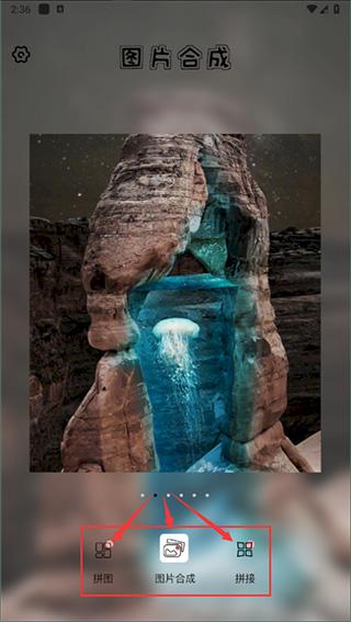 1、打开图片合并软件app,进入软件后你可以看到“拼图”、“图片合成”、“拼接”三个功能;