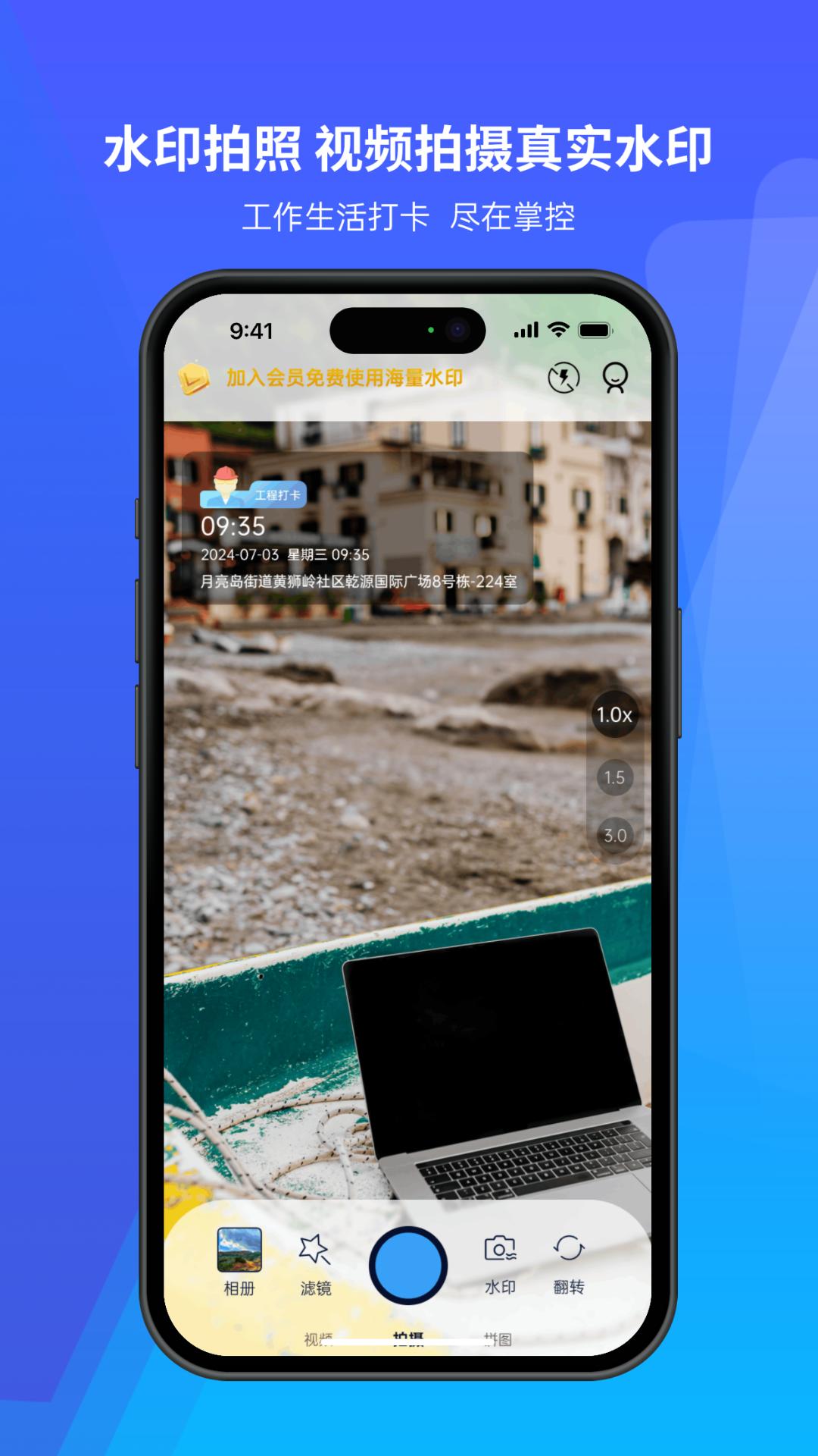 实时时间戳功能,显示拍摄时的日期、时间,满足跨国旅行或工作汇报需求。