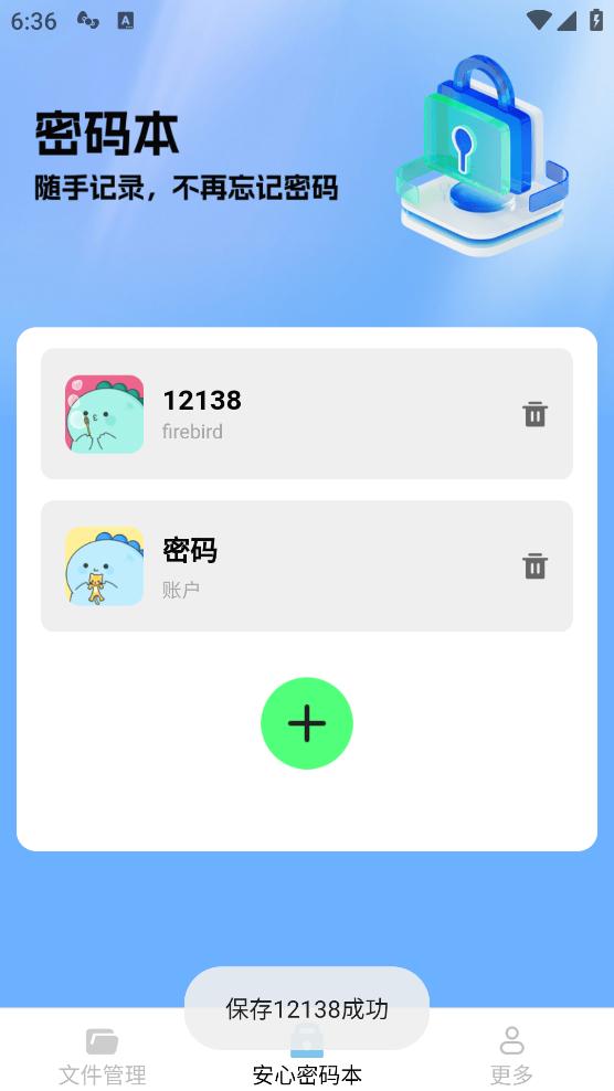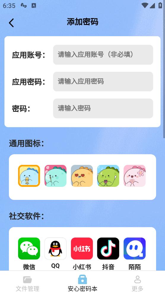【安心密码本】:快速分类管理各类型账号密码,提供社交应用图标,确保信息安全便捷,存于专属文件夹。