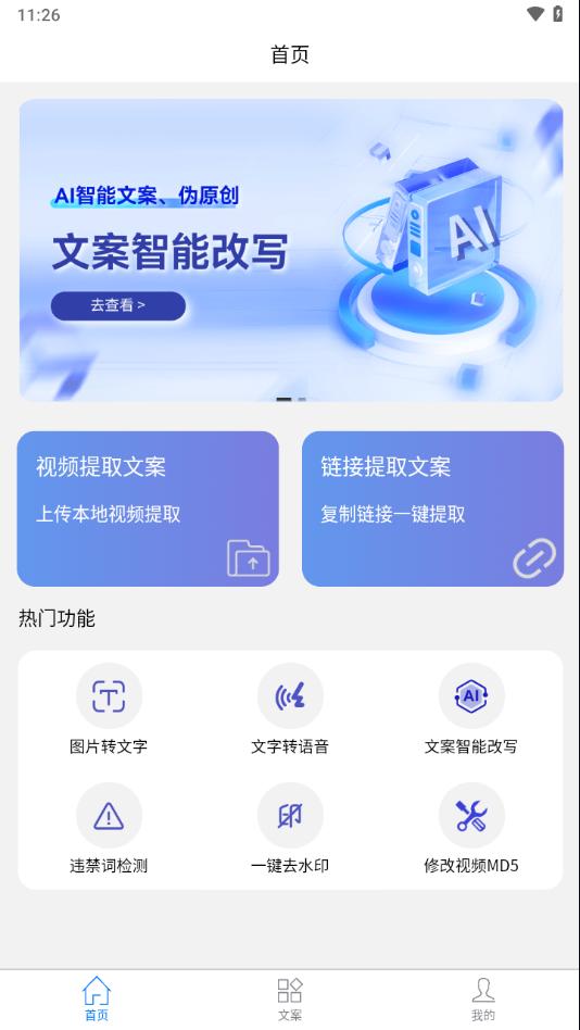 “文案提取改写”app 结合了文案提取,文案改写,文字转语音,去各大短视频平台水印,修改MD5和敏感词检测等多种功能,一个app实现文案梦想!