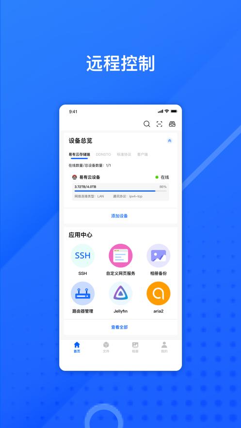 易有云app官方下载是一款私有云服务平台,平台拥有远程应用控制,本地相册备份,超级文件管理,设备智能分享等等功能服务,可以帮助用户获取更棒的存储服务。