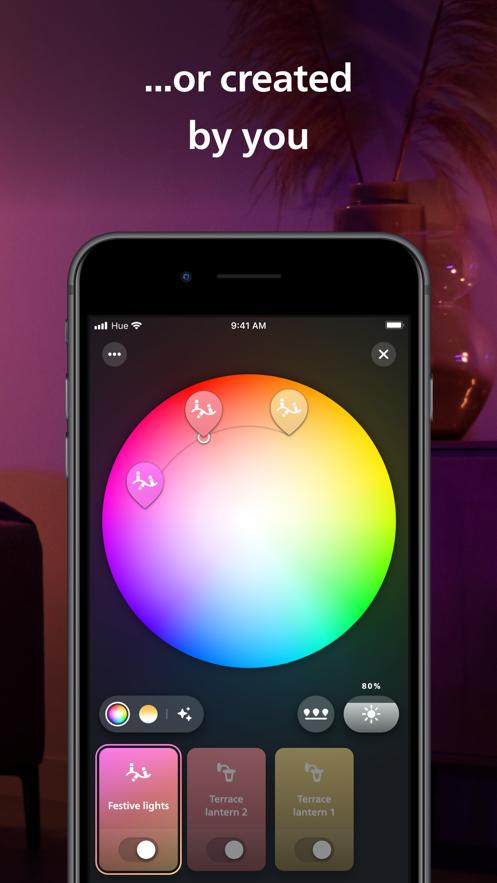 场景库中的场景由专业照明设计师精心设计,可以帮助您为各种场合营造适宜的氛围。 您甚至可以创建以选定图片或喜爱的配色设计的自定义场景。