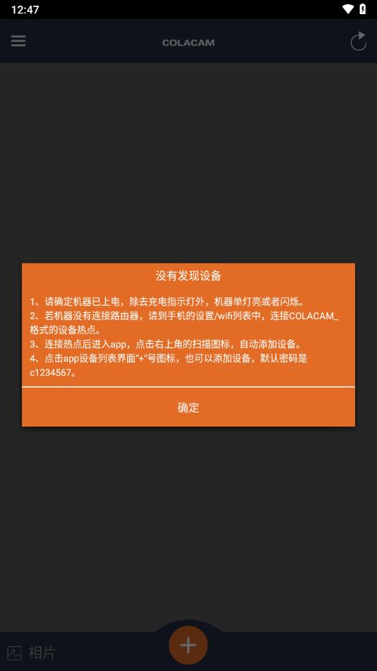 4、点击app设备列表界面"+"“号图标,也可以添加设备,默认密码是c1234567。