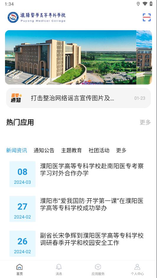 智慧濮医APP是通过对新闻,应用,消息的集成,为校领导,教职工,学生等角色提供统一的服务入口。
