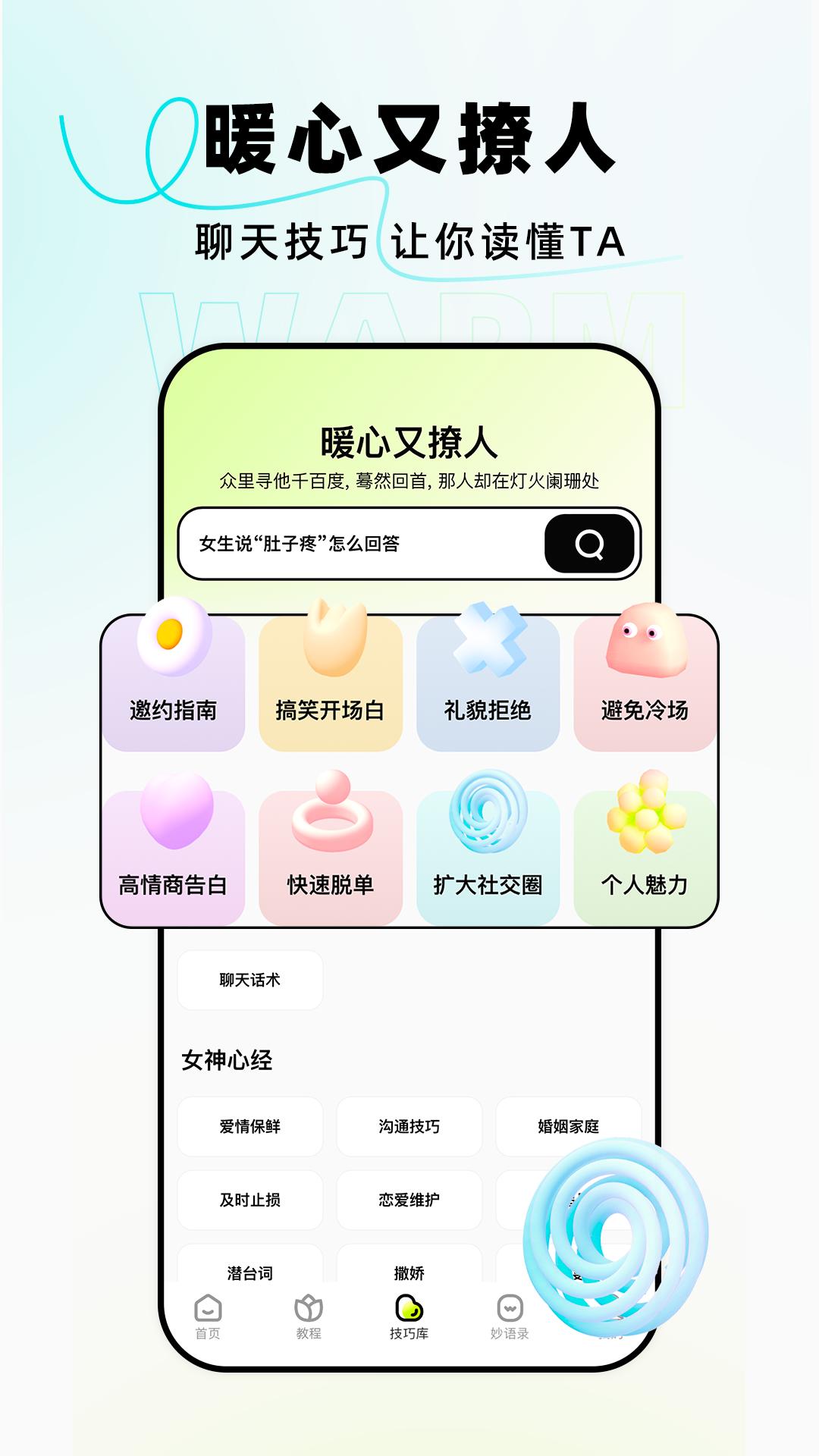 恋小爱是一款可以帮你解决聊天烦恼的App,海量话术库,遇到不知道怎么回复女生时,来这里搜一下,N+精彩回复供您选择,让您和女生聊天不再烦恼。