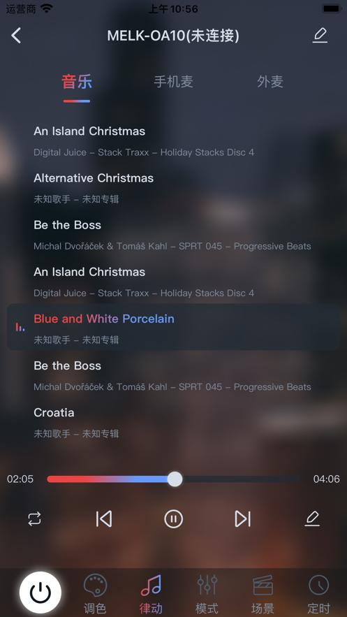律动功能可以选择播放手机本地音乐、手机麦克风试音以及硬件麦克风试音,