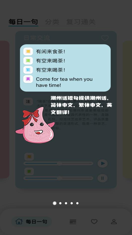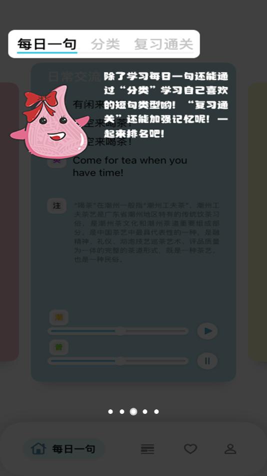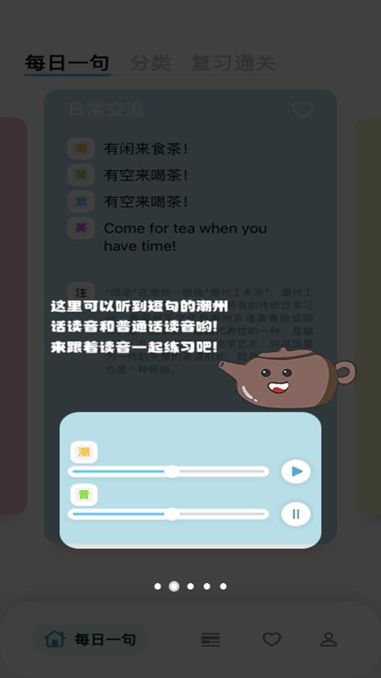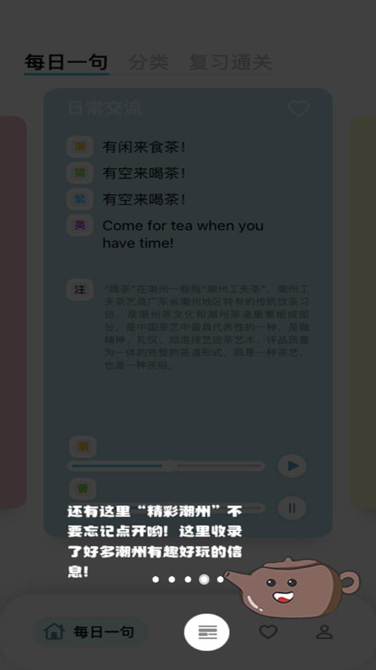 软件集趣味性、知识性于一体,收集的潮州话包括但不局限于潮州童谣、俗语、谚语、日常用语等,让使用者在快乐的学习过程中了解潮州话、普通话的日常会话。