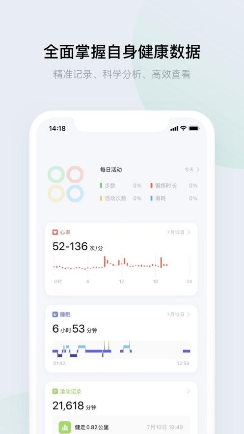 配合穿戴设备,提供完整的每日活动数据,科学的睡眠质量分析数据,丰富的运动记录数据等,让你的健康数据肉眼可见。