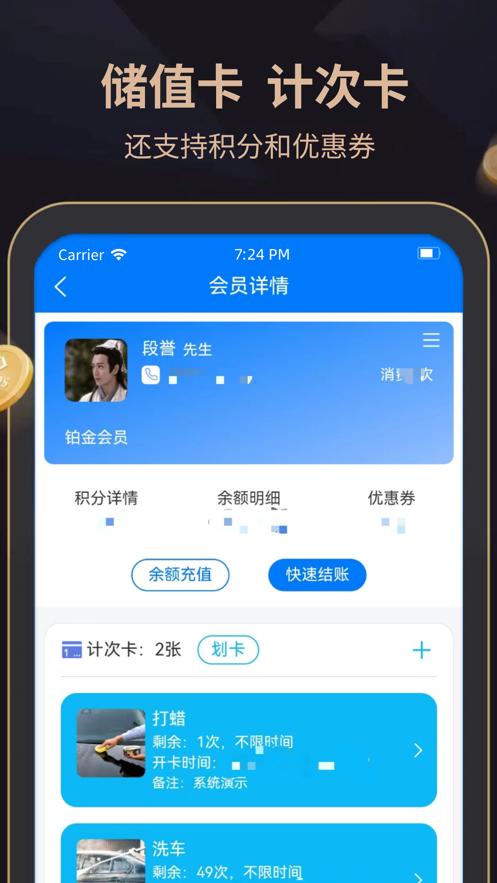 专业会员信息记录。灵活的会员卡规则设定。支持一人多卡。储值,次卡,时段卡,限时优惠多种类型灵活设置。