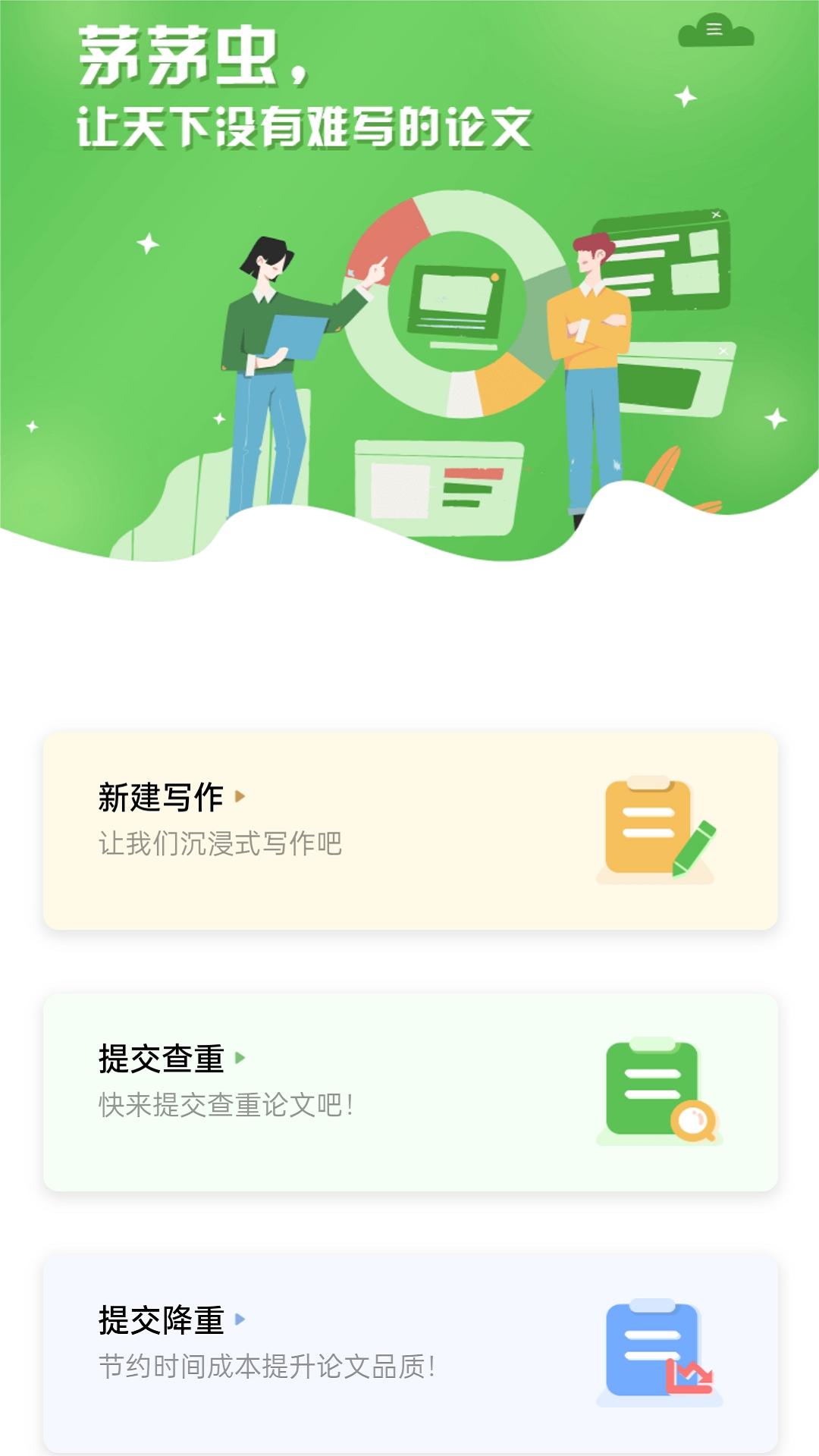 茅茅虫论文写作app下载是一款论文服务平台,平台拥有论文灵感,海量数据,提纲推荐,查重降重等等功能服务,觉得不错的朋友欢迎前来下载使用。
