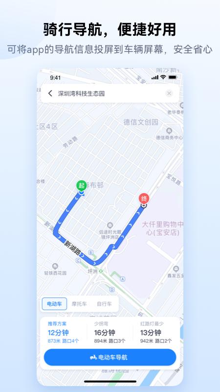 爱骑行功能涉及开解锁车辆、无感解锁、骑行导航、导航投屏、导航到车、寻车等功能;