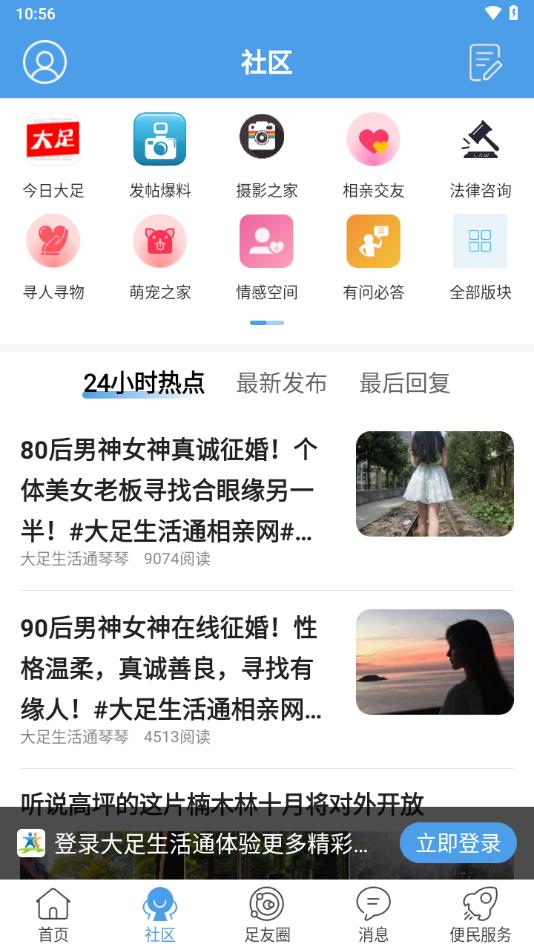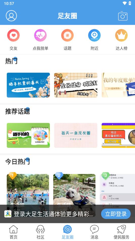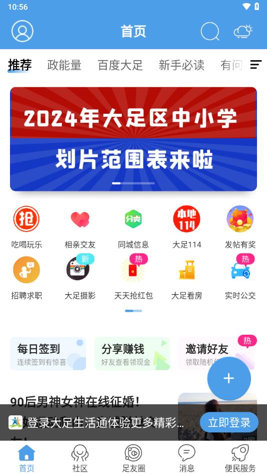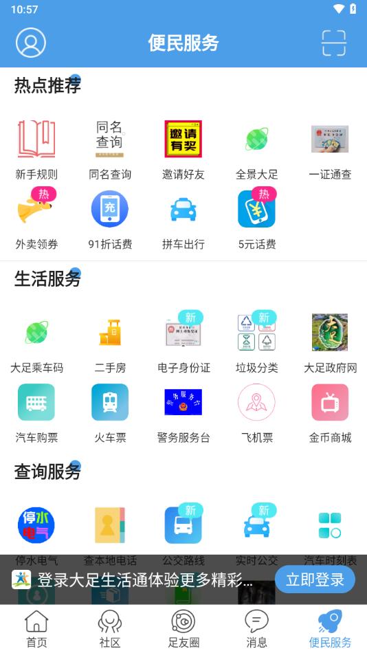 大足生活通APP是专为大足制作的本地服务平台,平台拥有首页,社区,足友圈,消息,便民服务等等功能板块,可以帮助用户更智慧便捷大足生活。