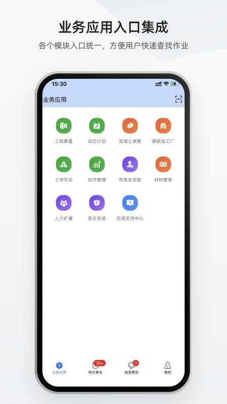 数字土木通APP最新版本是一款施工生产协管平台,平台拥有业务应用,待办聚合,信息聚合,我的等等功能板块,可以帮助更好的项目工程管理。