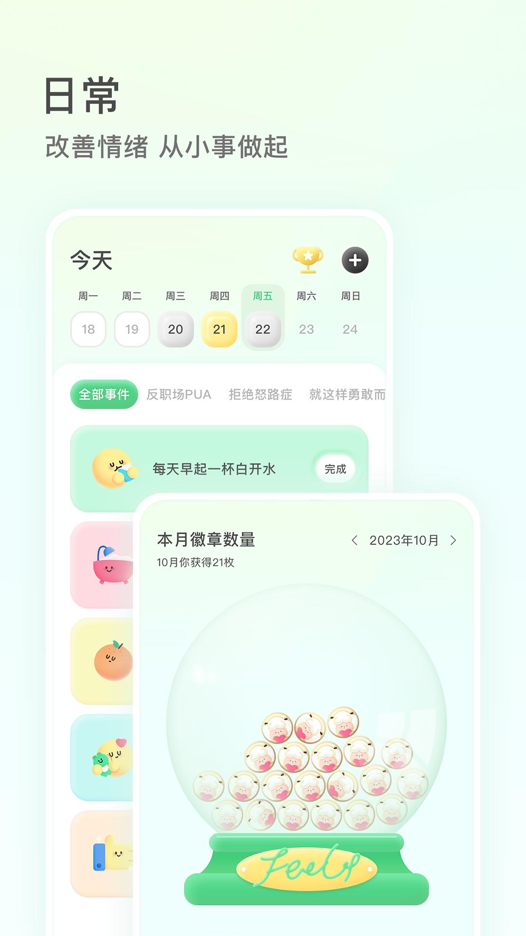 FeelFlow深知,改变往往始于微小之处。因此,应用特别设置了“日常小事”板块,鼓励用户完成一些简单却充满治愈力量的小事件。这些小事件涵盖了生活的方方面面,例如早起喝一杯温水、给远方的朋友发一条问候消息或者尝试一种新的美食。每当用户成功完成一个小事件后,就能获得一枚精美的奖牌作为奖励,这不仅是对个人努力的认可,更是激励自己继续前行的动力源泉。