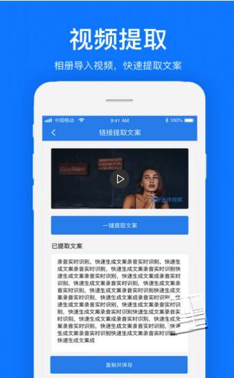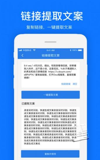 文案提取软件app一款非常方便的手机文字提取软件平台,更好的帮助用户在软件上获得很多便利,信息一键转换成文字非常简单,识别也非常准确,可以直接在平台上录制,音质非常好,软件可以直接屏蔽除录音以外的所有声音,提高办公效率,适用于各种场合,内存占用低,界面简洁,非常实用。。