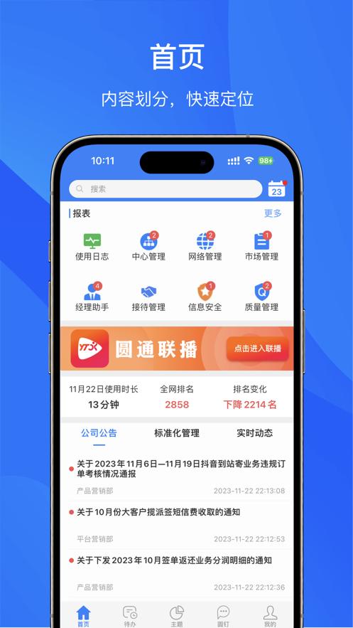 管理驾驶舱APP是专为圆通管理者制作,软件拥有中心管理,网络管理,市场管理,经理助手,质量管理,圆钉等等功能服务,可以帮助更好的快递工作。