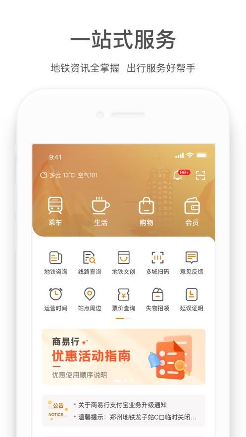 商易行app下载是郑州地铁官方手机客户端,软件拥有扫码刷脸乘车,优惠活动,地铁资讯,失物招领等等功能服务,可以帮助用户更好的地铁出行。