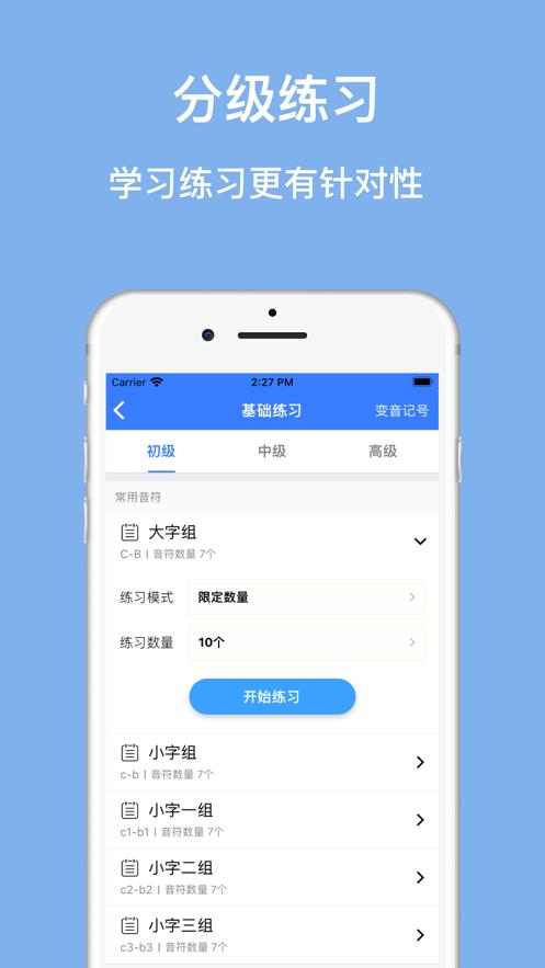 考虑到很多刚接触五线谱的用户遇到这么多钢琴键而不知所措的情况,我们针对性的将基础练习分为初级、中级、高级。在初级中我们将每个组别单独拎出来做练习,这样能让用户更好的练习和巩固。