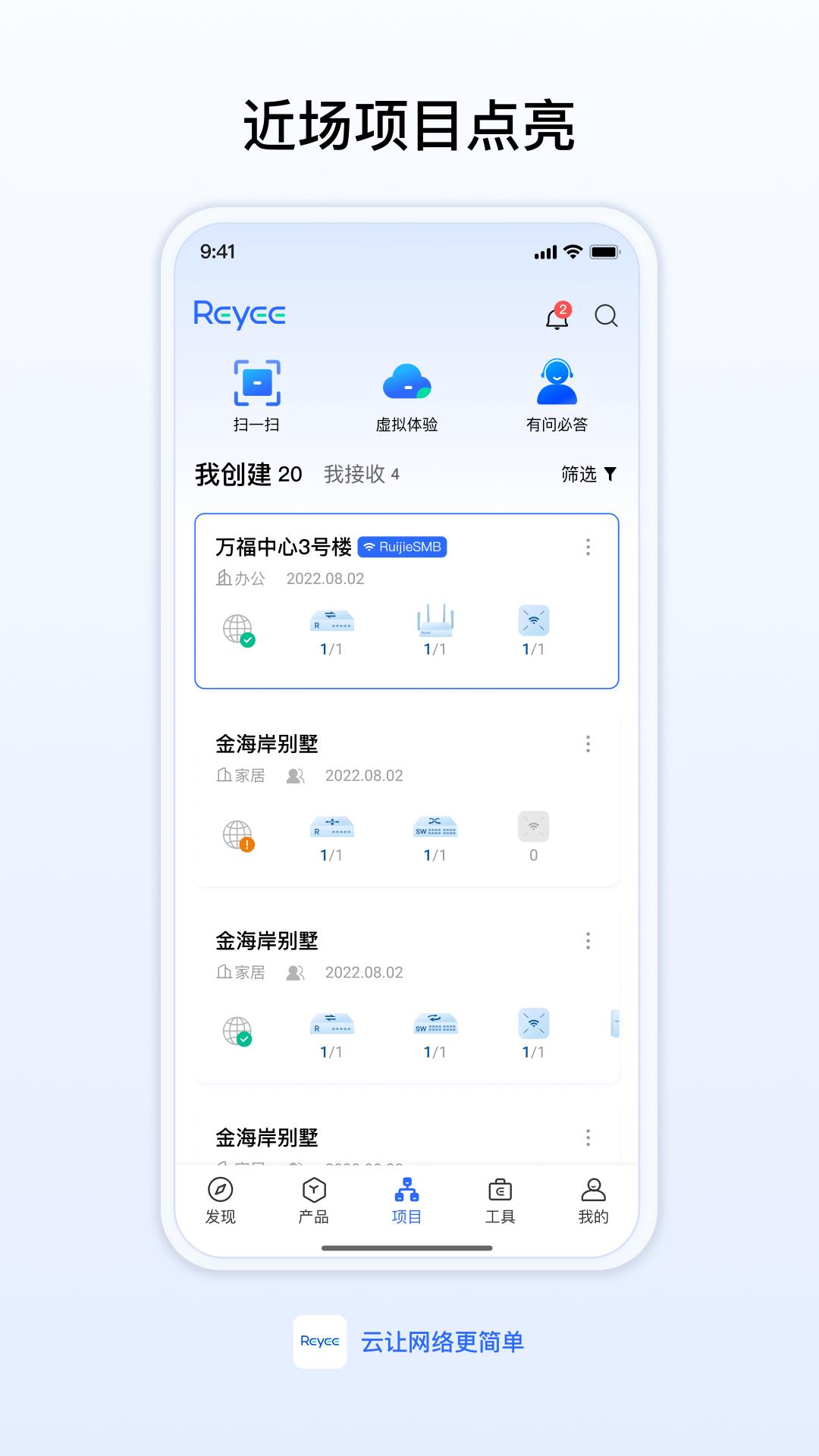 锐捷睿易app是锐捷网络股份有限公司官方倾情推出,软件社区,产品,项目,工具,我的等等功能服务,可以帮助用户更好的管理网络。