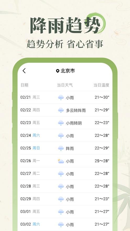 该应用能够准确定位至小区街道并即时推送天气信息,甚至预测雨雪时间。