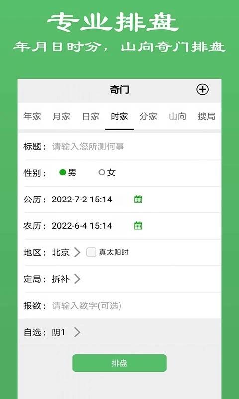 2.具有以下起局方式:年家奇门;月家奇门;日家奇门;时家奇门;刻家奇门;自定义奇门(自己选择布局);搜局(搜索一段时间符合条件的奇门局)。每种方式配有报数起局可供选择