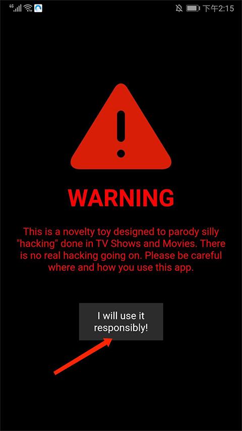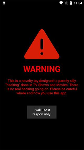 1、打开geektyper手机版,进入应用主界面就有一种黑客的感觉了,点击下方【I will use responsiblly】提示,