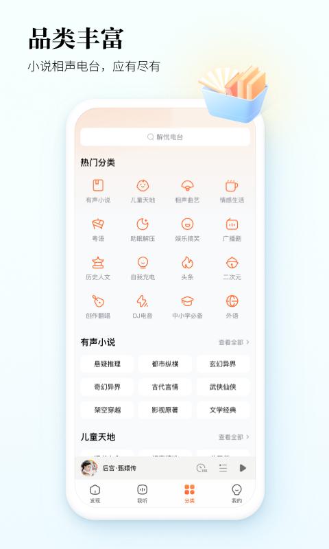 这里有声小说、名家评书、相声小品、助眠解压、历史人文等等,海量音频资源应有尽有,随时随地任你畅听。