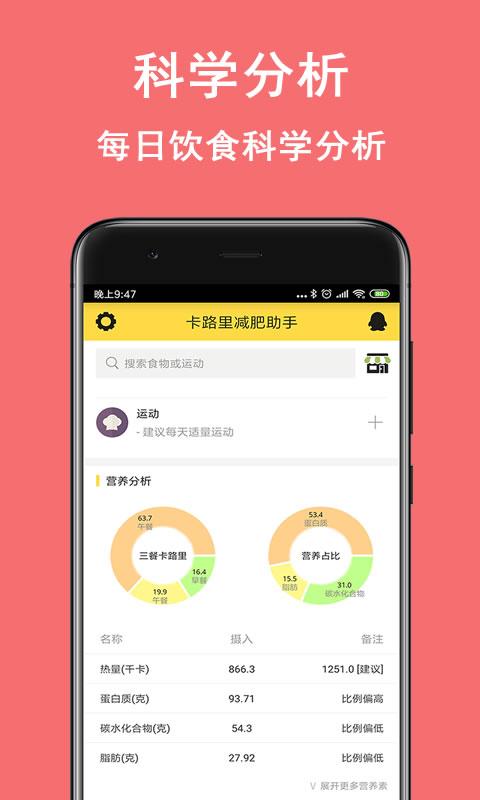 午餐和晚餐所摄入的卡路里数值,让用户清楚了解到自己需要消耗多少卡路里才能起到减肥瘦身的作用;软件提供分享功能,快把这个好用的软件推荐给你的好朋友,一起减肥瘦身效果更好,