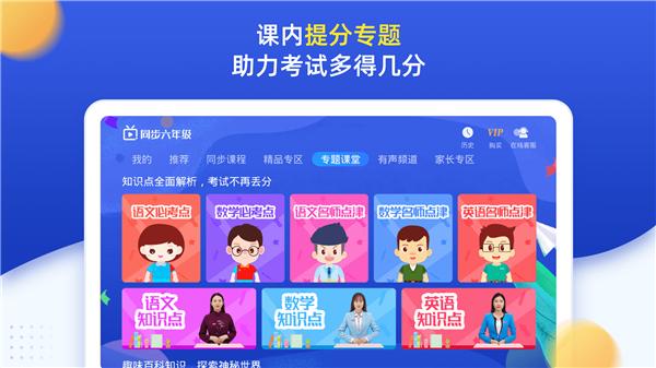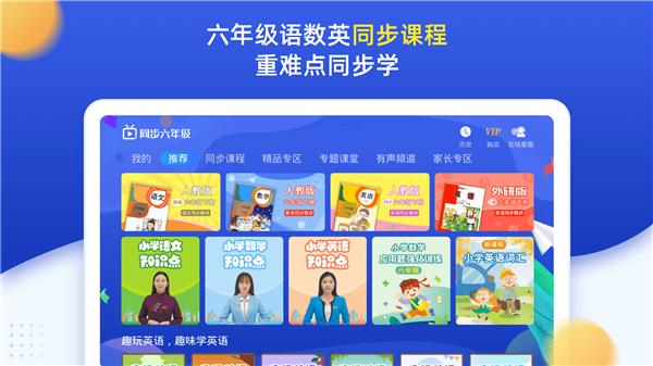 小学六年级同步课堂:语文、数学、英语、科学上下册跟教材完全同步的辅导课程。