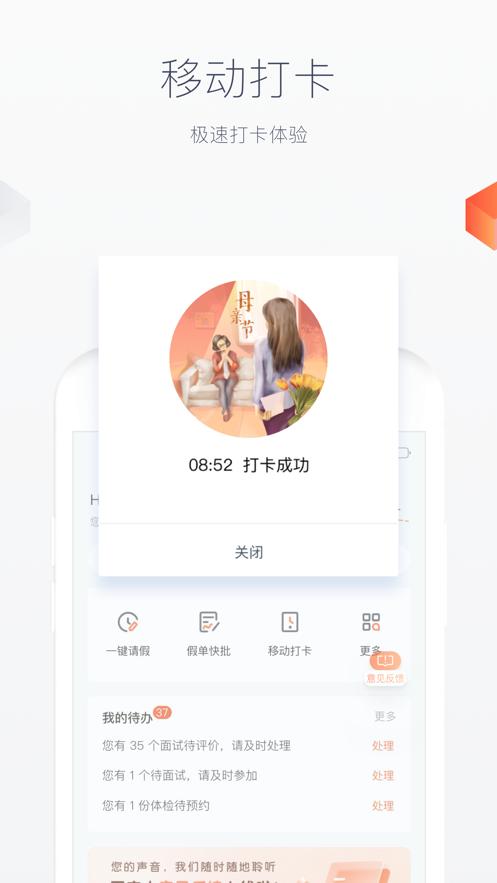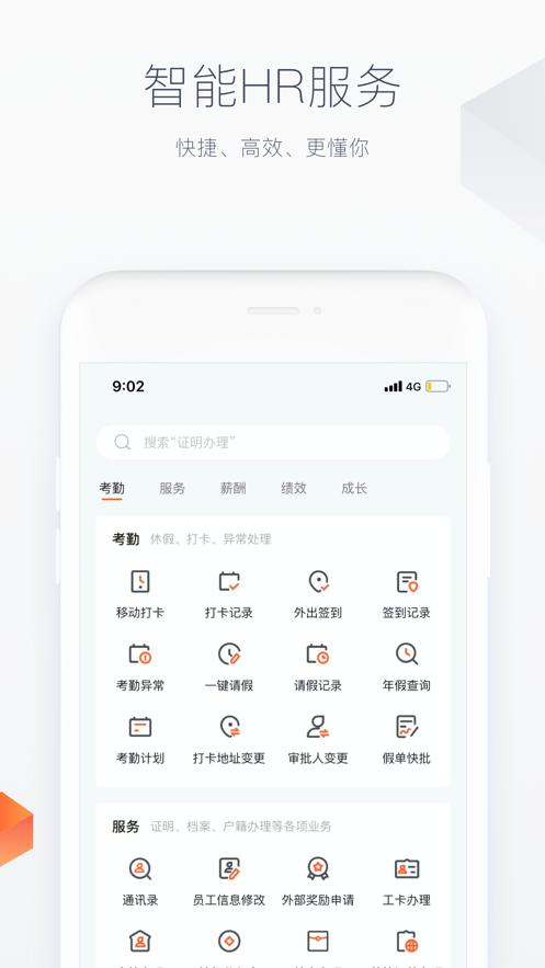 为员工提供在企业的职业生涯全周期所需的HR服务,包括:职前保温、入职、转正、调配、晋升流程、移动考勤、请休假、绩效考核、人才发展、招聘内推、个人信息查询、合同管理、证明办理、工资社保查询、智能员工咨询、员工关怀、福利平台、健康管理、培训学习、离职流程…