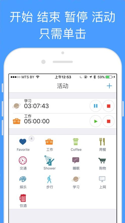 通过点击活动类型图标开始记录时间,完成后按暂停或停止 (即使关闭软件仍会记录时间,不必担心数据中断)