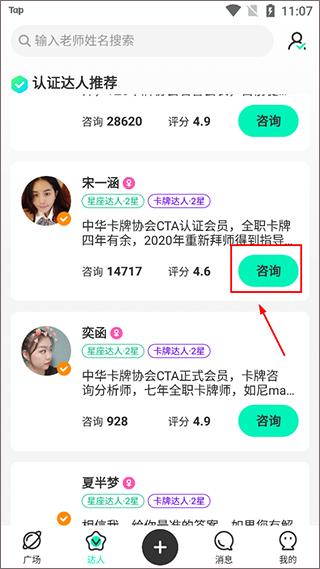 3、选择好后,在达人的个人页面,点击下方【咨询】后,选择需要咨询的类目与咨询师进行沟通。