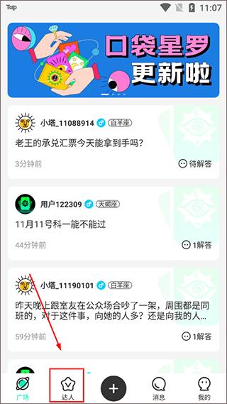 1、打开登录口袋星罗app,点击下方的【达人】;
